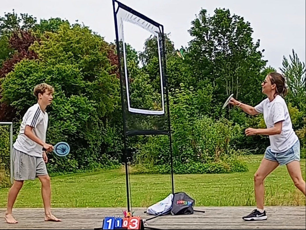 Spil med gummi- eller fjerbolde gennem det hvide spillenet. Spil for sjov, eller med bane, pointtavle og spilleregler. Nemt at lære, sværere at mestre. Alt udstyr og bæretaske følger med. Tag det med i hånden, på cyklen eller bag i bilen. Sæt op og spil på få minutter. Spil i haven, parken, på gaden, stranden og indenfor. Udviklet til sjov, fælles aktivitet for børn, unge og voksne - som hurtigt ender med: “Bare én kamp mere.”